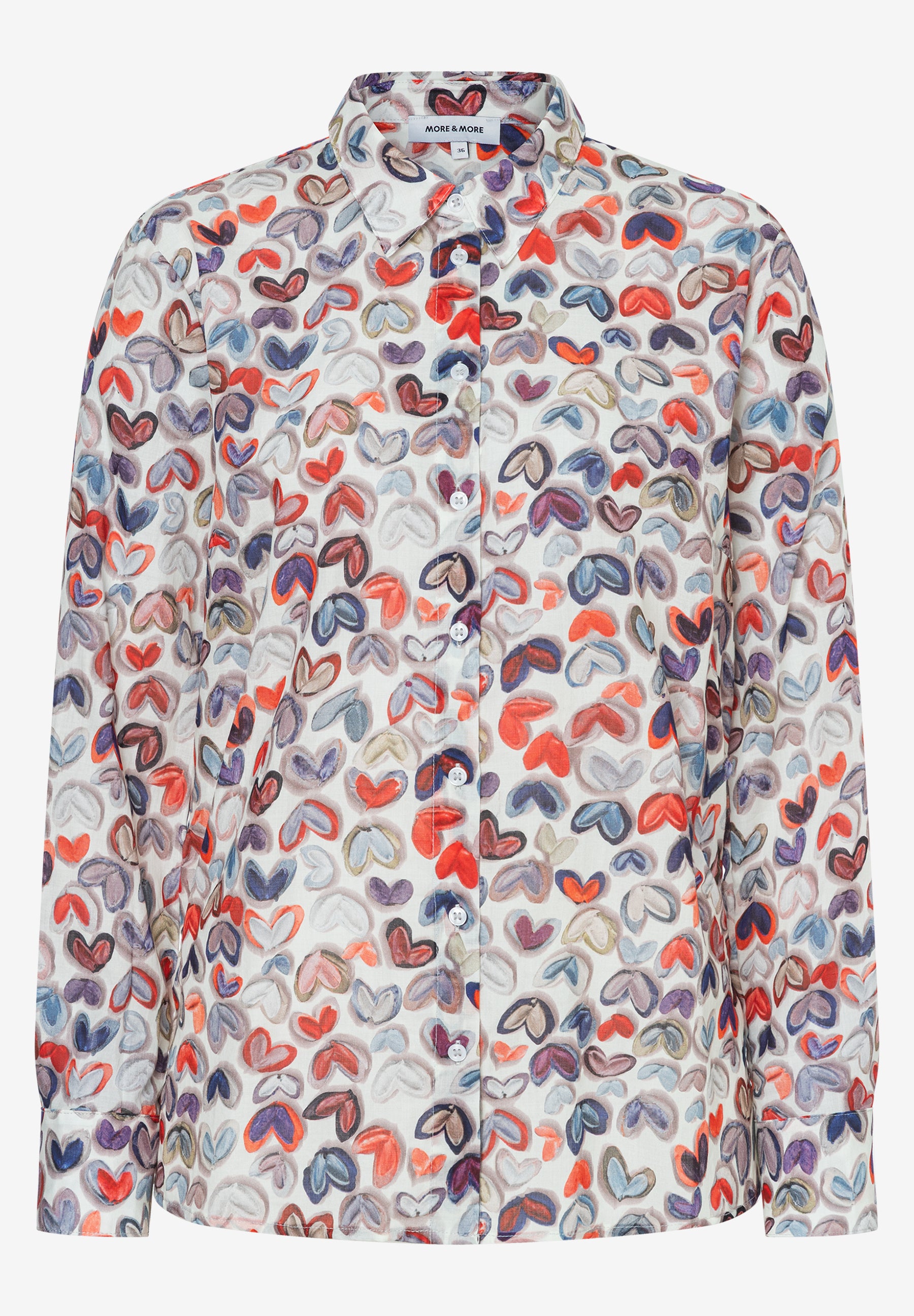 Diese attraktive Hemdbluse von MORE & MORE bringt Frische in Ihren Kleiderschrank. Der klassische Kragen und die durchgehende Knopfleiste treffen auf einen verspielten Allover-Herz-Print in rot/blau. Stylen Sie die hübsche Bluse mit verwaschener Jeans, sportiver Chino oder mit seriöser Businesshose zu einem modernen Look mit einem Hauch Romantrik.
