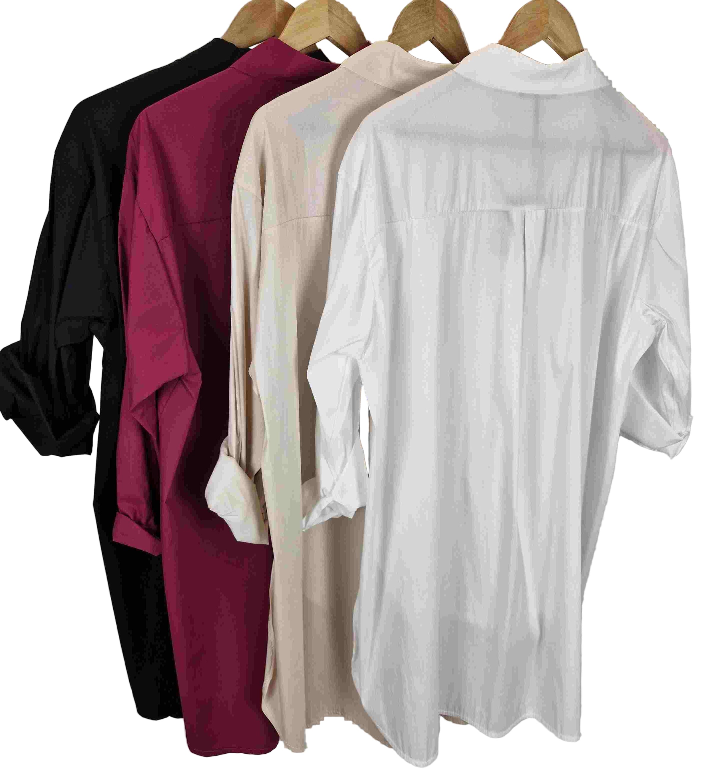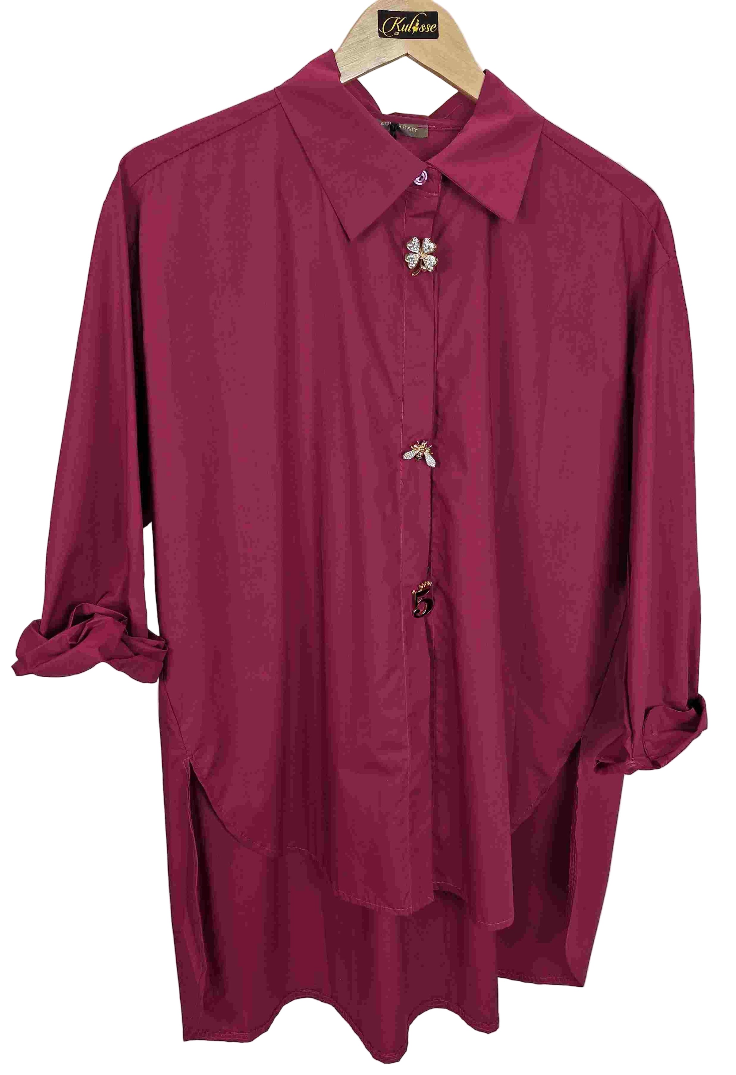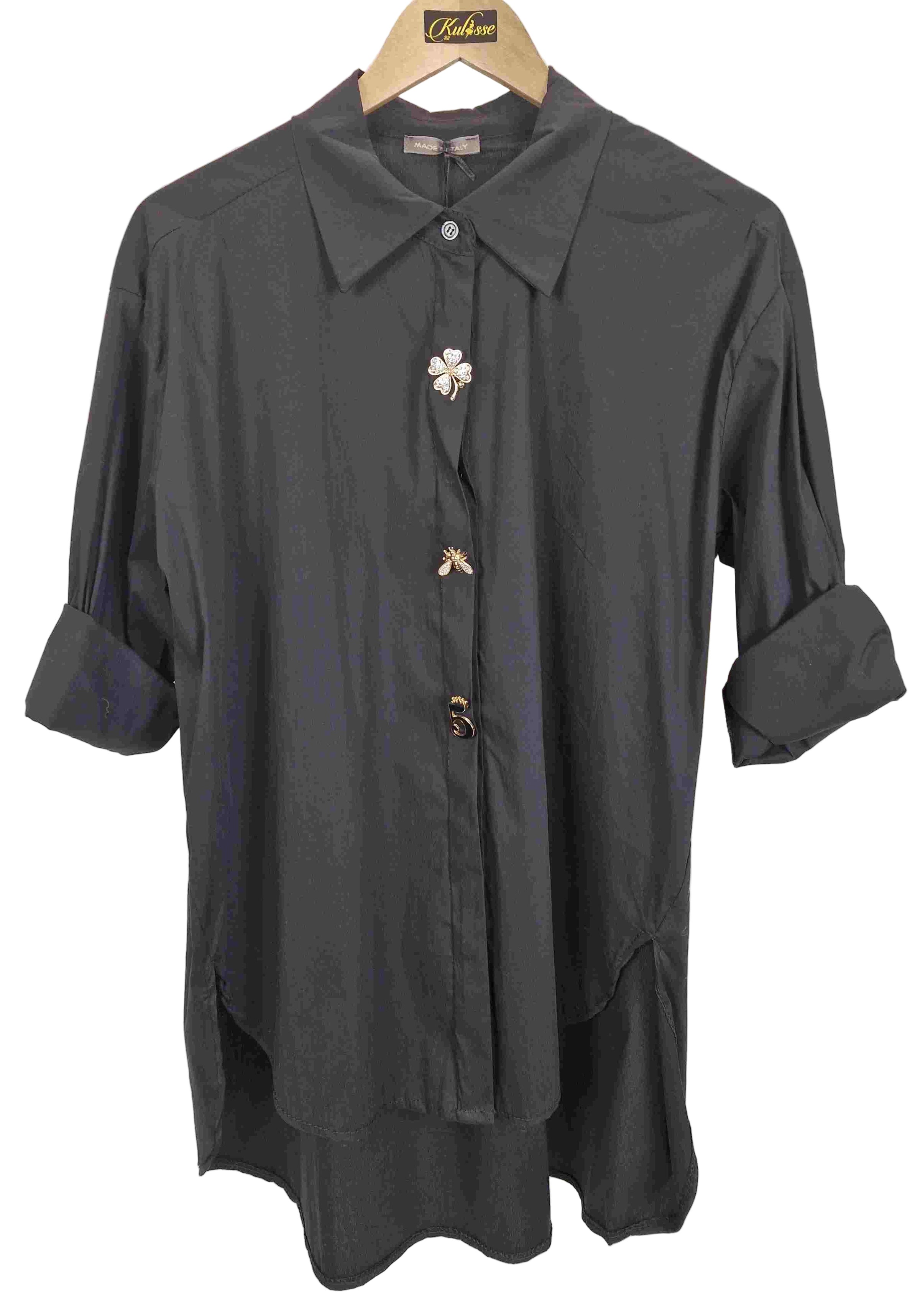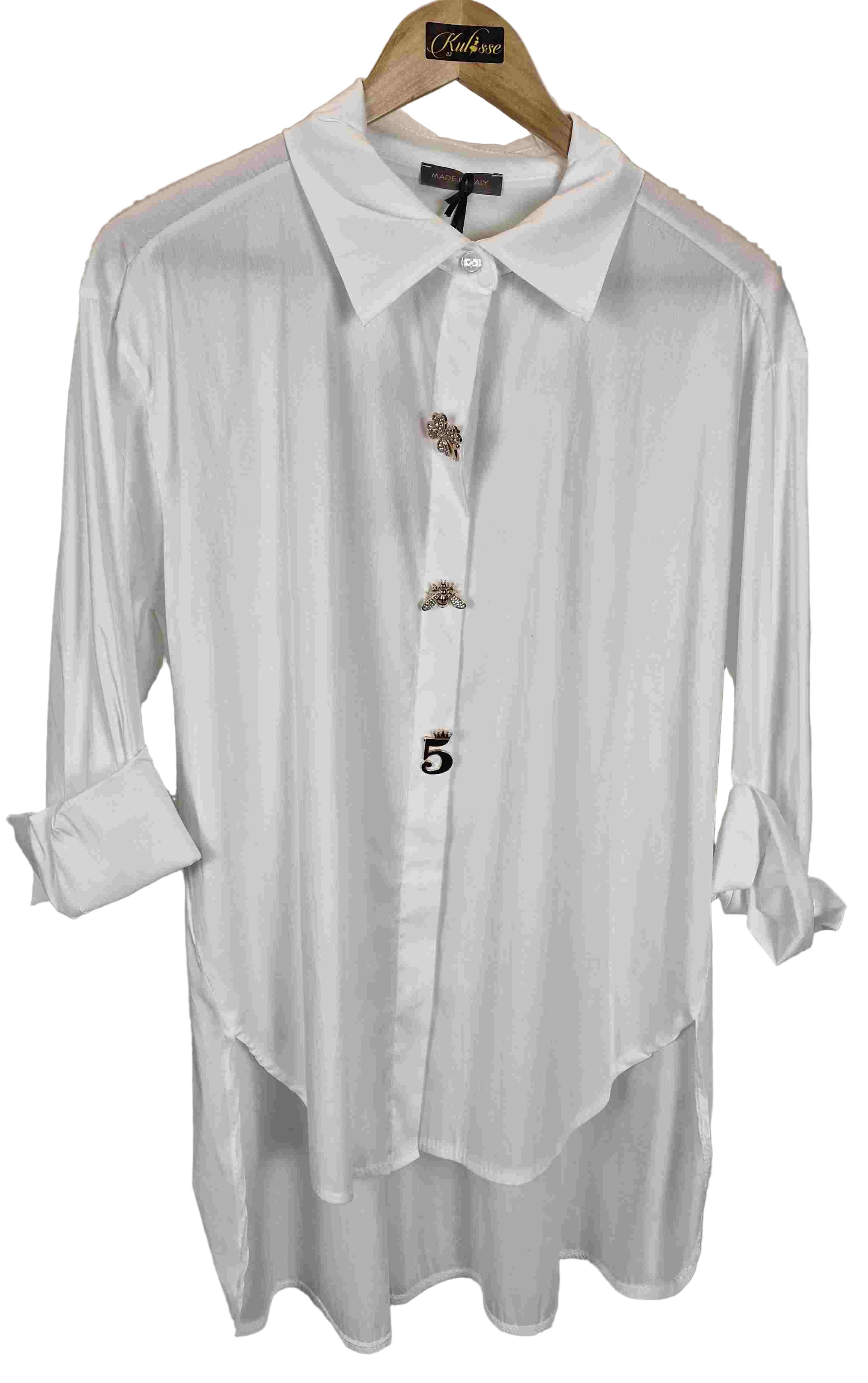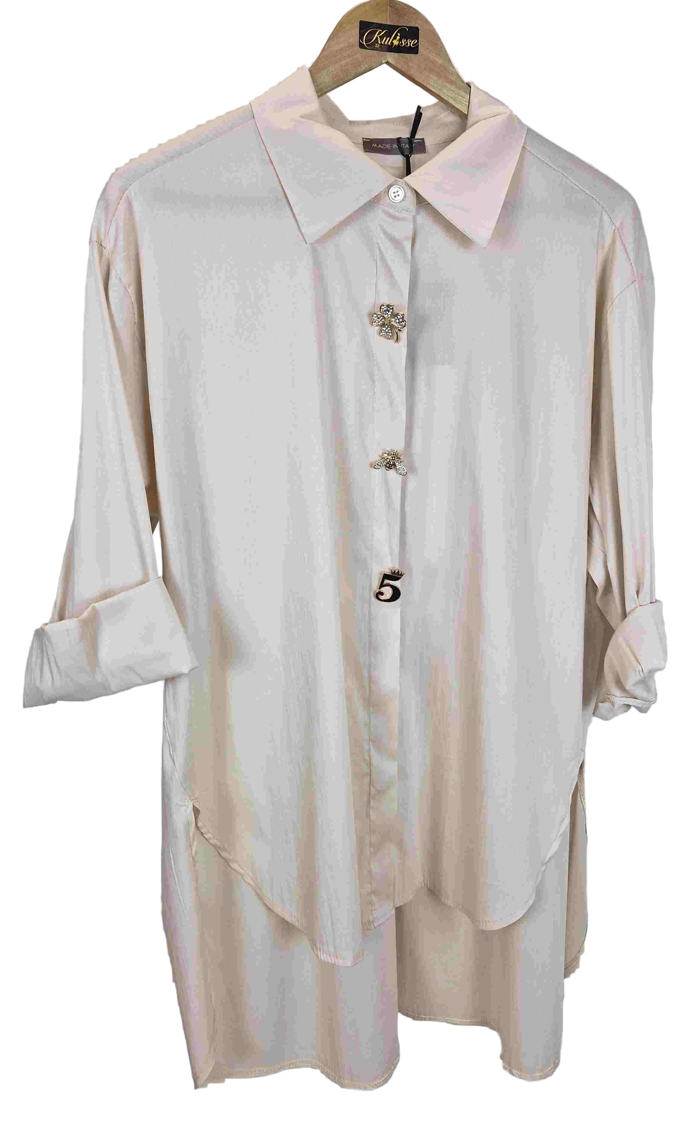 Longbluse in Popeline, mit Kragen und Manschetten. Hinten länger mit Kellerfalte. Verdeckte Knopfleiste mit 3 süßen Broschen als Verzierung.