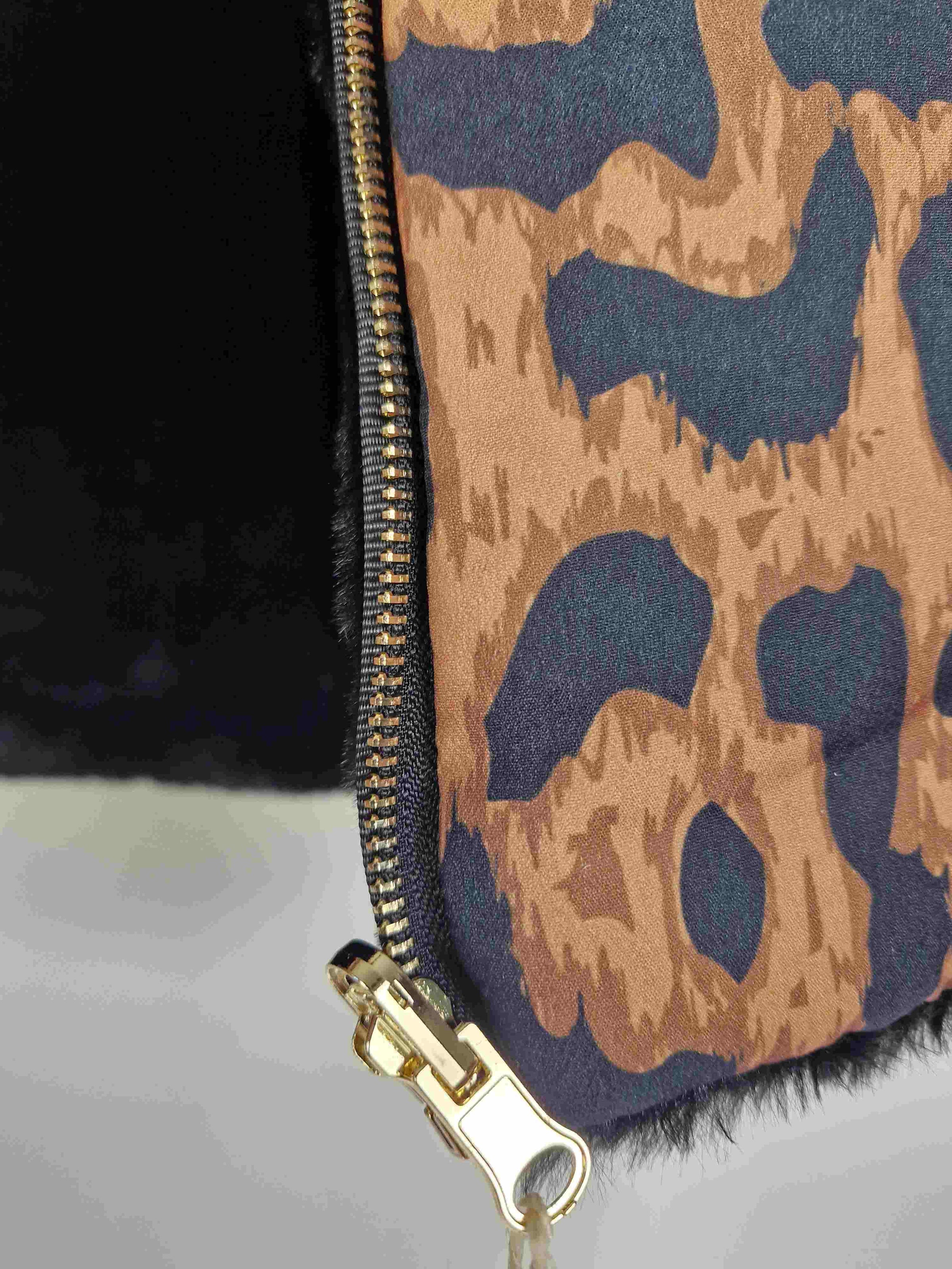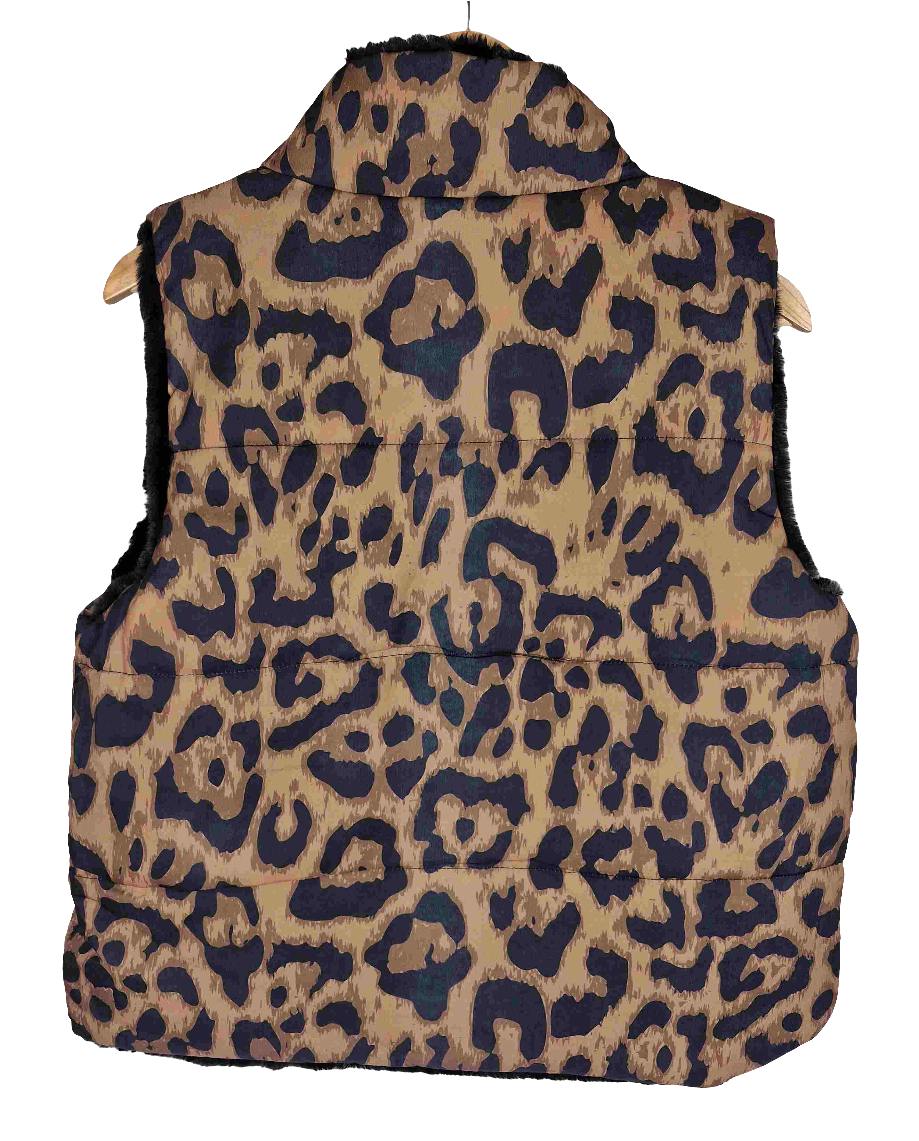 Wende-Weste im angesagten Leo-Fake-Fur-Look. Beidseitig 2 Taschen. Passend von 36 – 42.