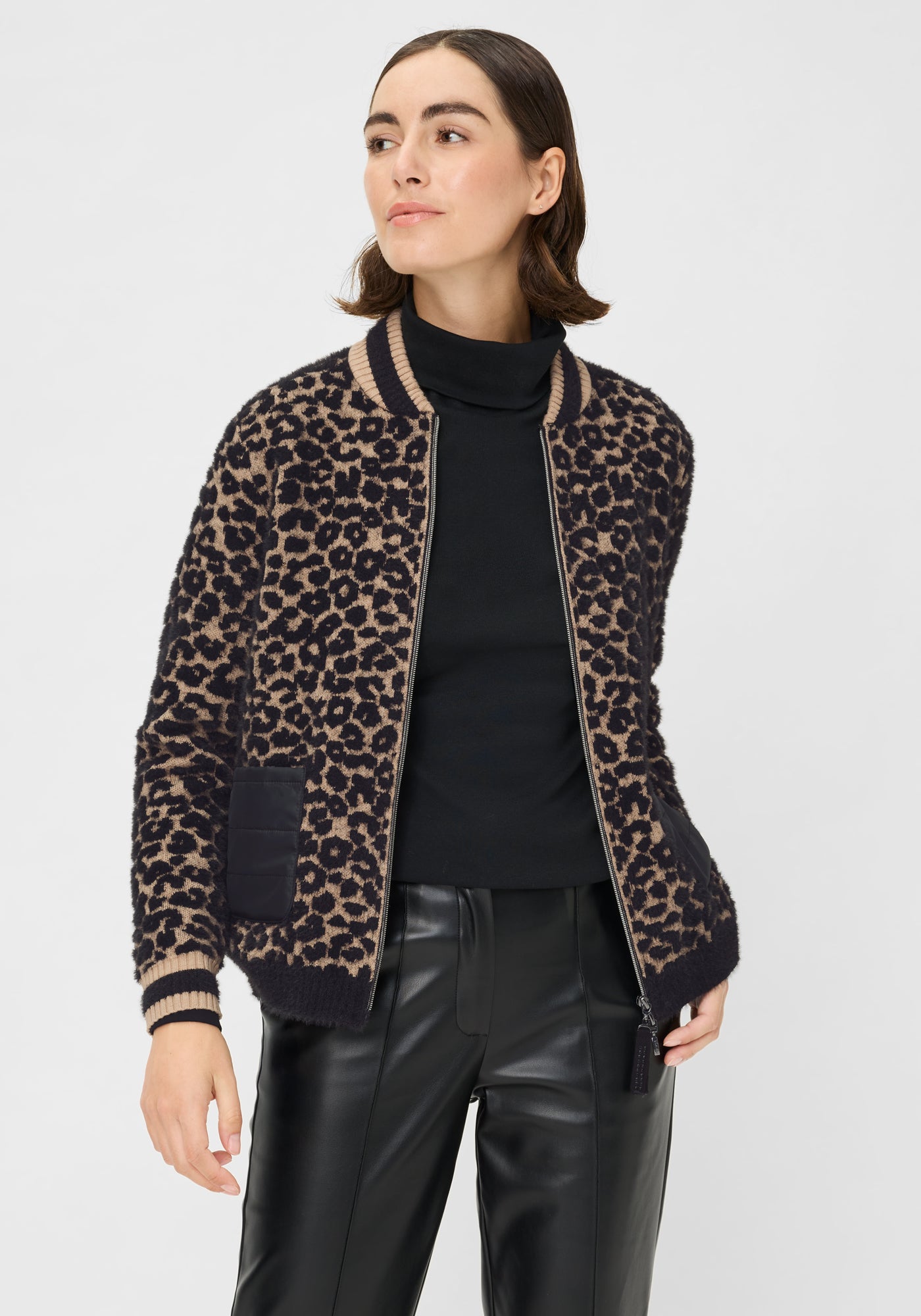 Dieser Cardigan in Jacken-Optik ist ein modisches Highlight mit spannender Material- und Mustermischung. Die Vorderseite und Ärmel zeigen sich in flauschigem Leo-Jacquard, während die gesteppte Rückseite in Uni-Schwarz für eine moderne Kontrastwirkung sorgt. Der kleine Stehkragen und die durchgehende Reißverschlussleiste unterstreichen den sportiv-eleganten Look. Zwei aufgesetzte, gesteppt-gefütterte Taschen runden das Design funktional ab. Geschnitten in der geraden Olsen-Passform „Henny“ bietet dieser Cardigan hohen Tragekomfort bei stilvollem Auftritt. Länge ca. 60 cm.