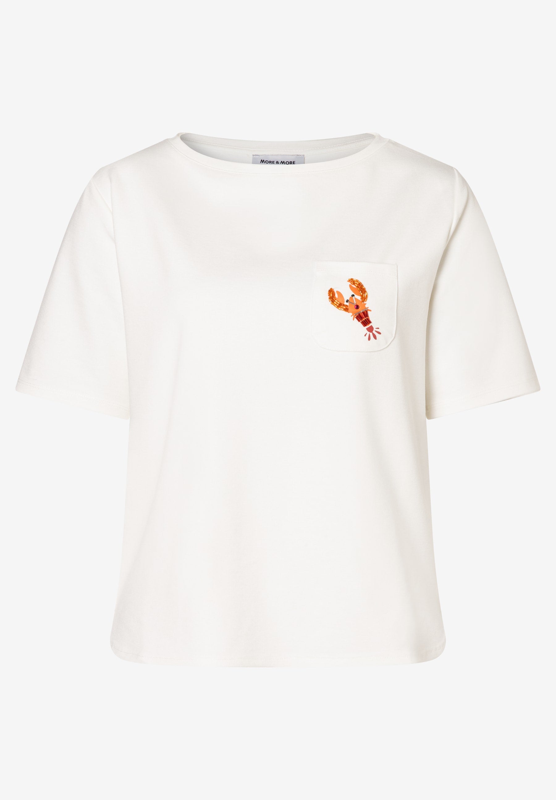 Dieses T-Shirt von MORE & MORE mit rundem Ausschnitt und kurzen Ärmeln punktet mit cleanem Design und einem kleinen Pailletten-Lobster auf der Tasche. Easy zu kombinieren, egal ob zur Jeans, zum Rock oder auch zur seriösen Businesshose.